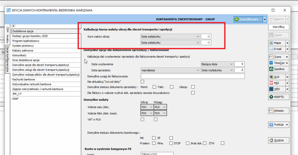 12. Kartoteka kontrahenta – Kurs waluty dla zleceń rozdzielono na: