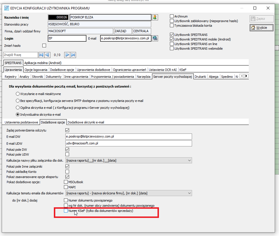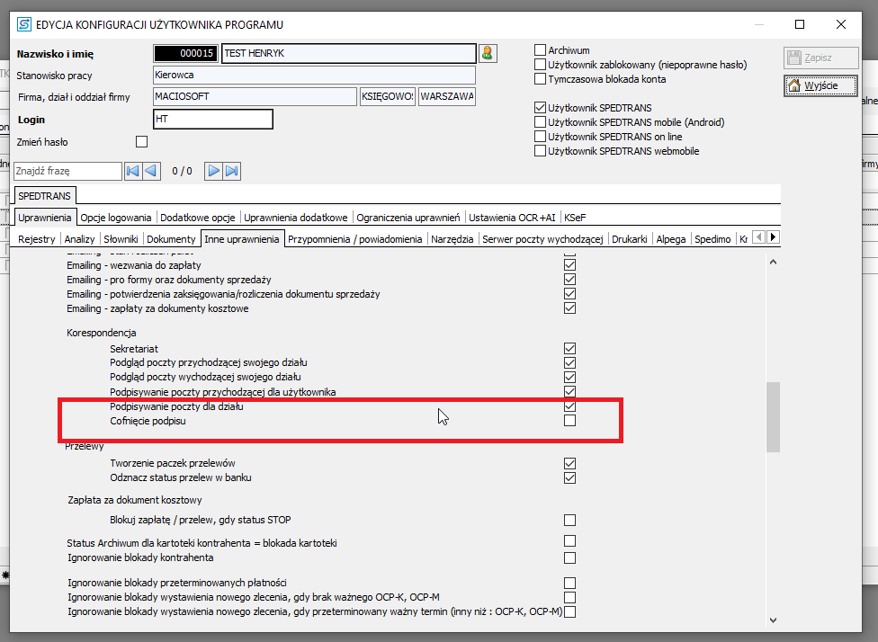 Uwaga! Domyślnie użytkownik nie ma tego uprawnienia. Należy nadać w konfiguracji użytkownika.