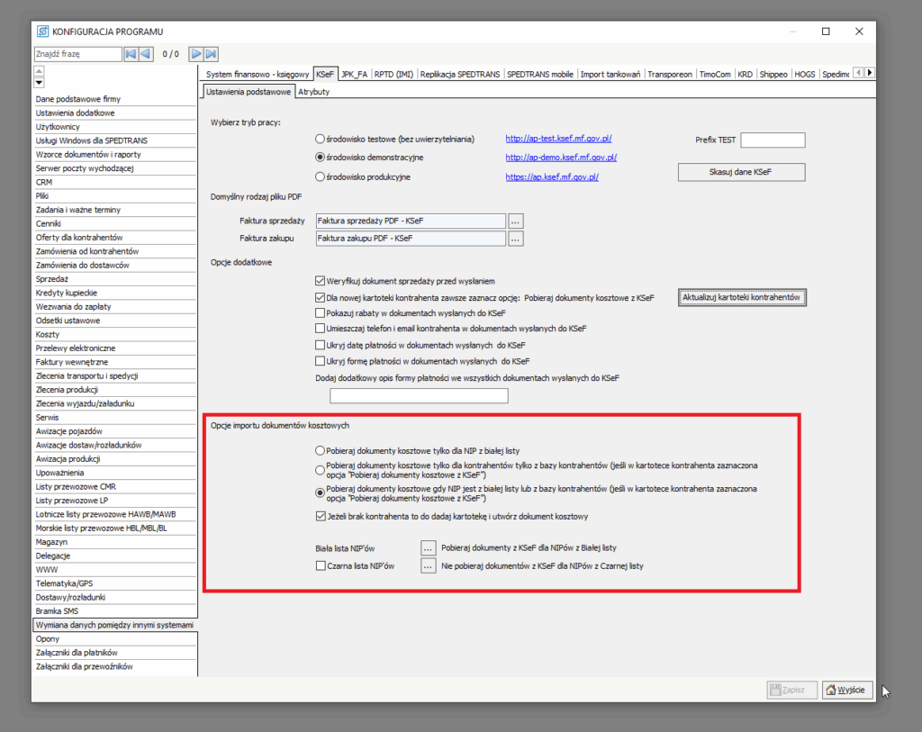 – Pobieraj dokumenty kosztowe gdy NIP jest z białej listy lub z bazy kontrahentów (jeśli w kartotece kontrahenta zaznaczona opcja “Pobieraj dokumenty kosztowe z KSeF”)