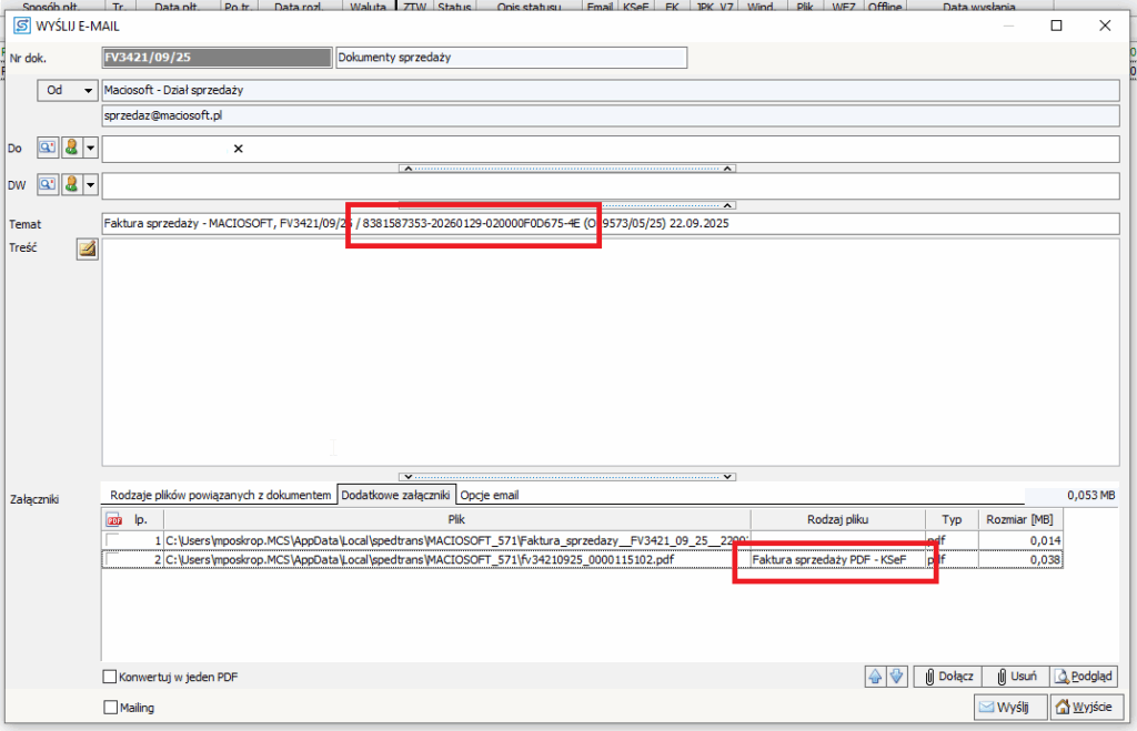 – Wysyłanie dokumentów sprzedaży – dodano możliwość dodania numeru KSeF do tematu wiadomości e-mail.