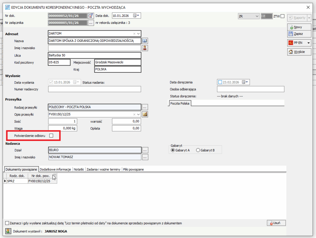 23. Dokument korespondencji przychodzącej – dodano pole: Potwierdzenie odbioru.