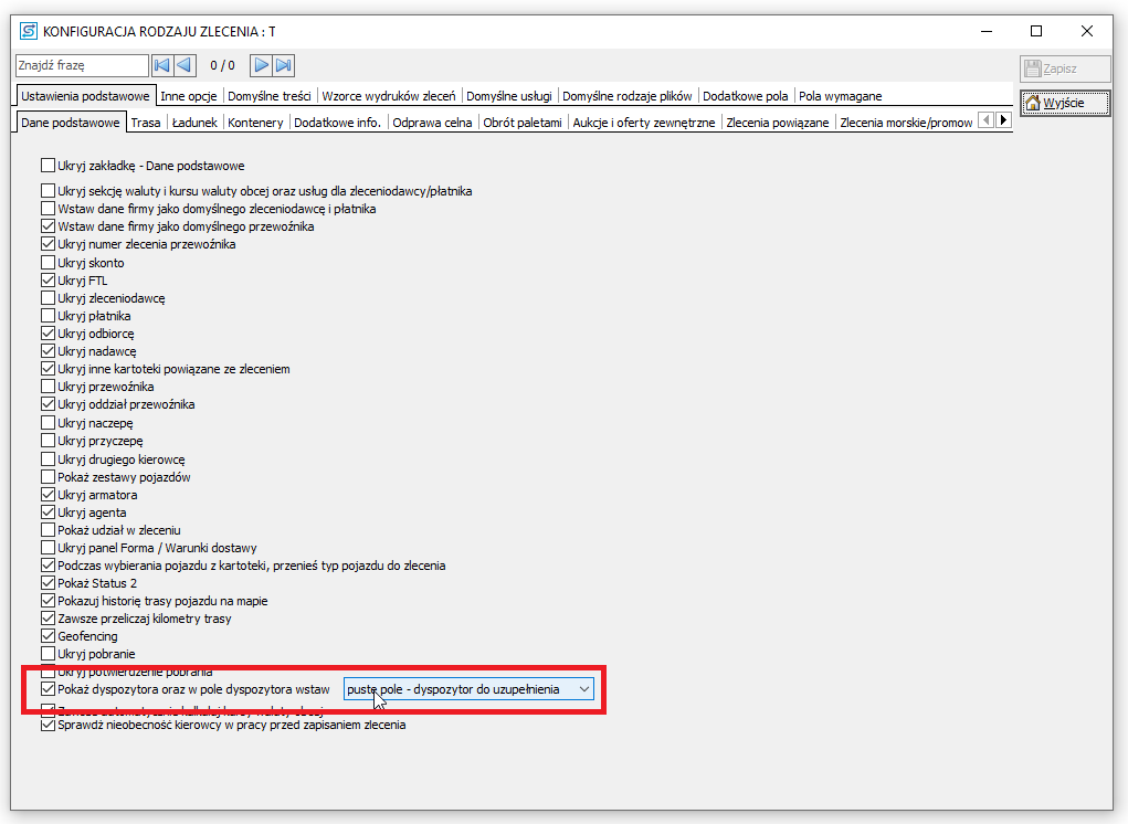 4. W Konfiguracji szczegółowej zleceń transportu / spedycji dodano opcję, która umożliwia pozostawienie nieuzupełnionego pola dyspozytora przy tworzeniu nowego zlecenia: