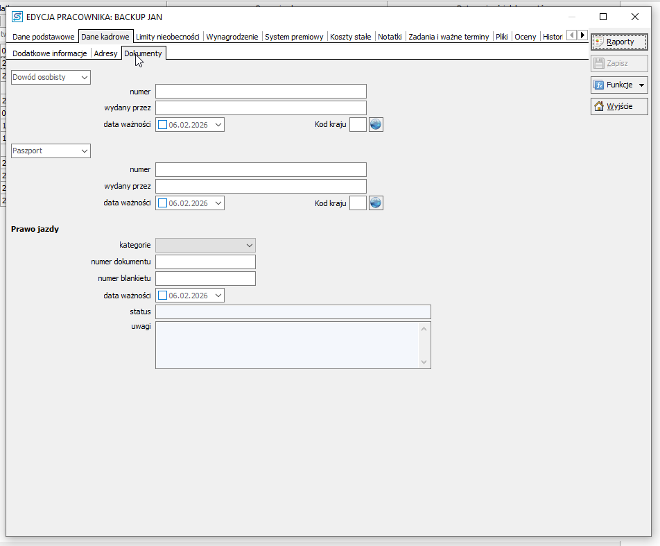 6. Kartoteka kierowcy – uporządkowano układ danych, dodano zakładkę Dokumenty oraz dodano dodatkowy dokument tożsamości (paszport)