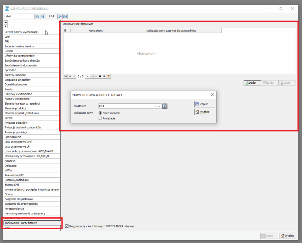 – W głównej konfiguracji programu dodano możliwość podania dostawcy kart flotowych oraz określenie sposobu kalkulacji ceny bazowej – wykorzystywane przy refakturowaniu przewoźników.