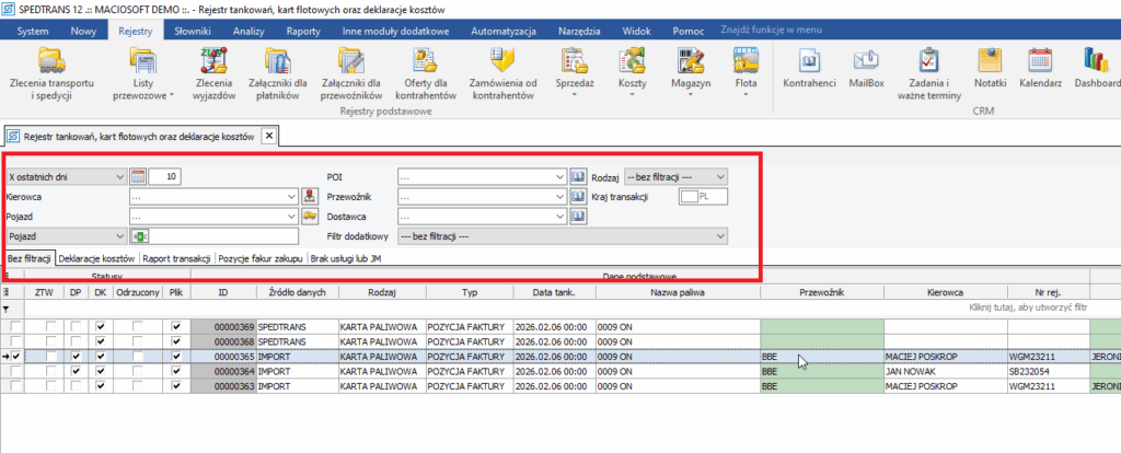 Rozbudowano możliwości filtracji danych w rejestrze Tankowań i kart flotowych.