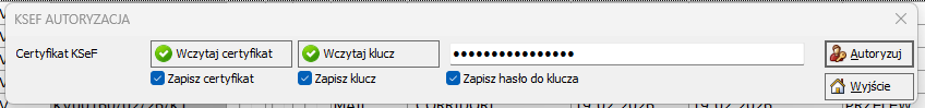 Zapisz każde z nich checkboxem poniżej, jeżeli chcesz by zostały zapisane permanentnie. Po zaznaczeniu tych opcji system zapamięta wprowadzone dane i będzie je automatycznie uzupełniał przed uwierzytelnieniem. Może to być szczególnie przydatne w sytuacji, gdy istnieje ryzyko korzystania z innego komputera lub konta użytkownika. Jeżeli opcja „Zapisz hasło do klucza” nie będzie zaznaczona, przy każdej wysyłce faktur do KSeF konieczne będzie ręczne wprowadzenie hasła certyfikatu.