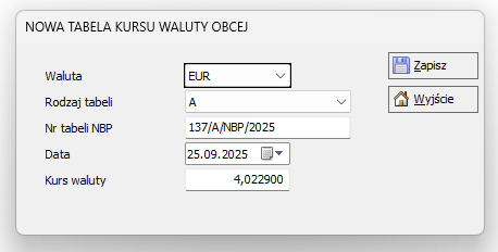 Ręczne dodawanie lub przeglądanie kursów walut odbywa się w rejestrze Tabele kursów walut wg NBP.