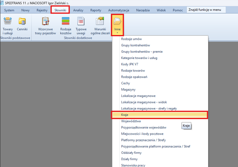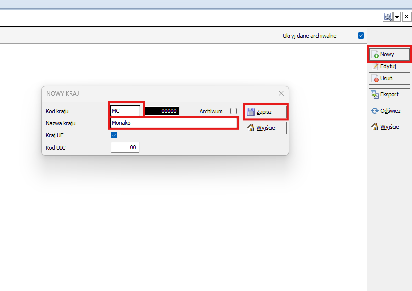 Funkcjonalność dodawania kraju umożliwia użytkownikowi rozszerzenie dostępnych opcji systemowych o nowe lokalizacje geograficzne. Dzięki temu użytkownik zyskuje możliwość wyboru wcześniej zdefiniowanego kraju podczas tworzenia zleceń oraz generowania dokumentów.