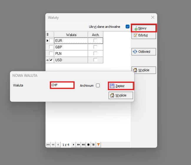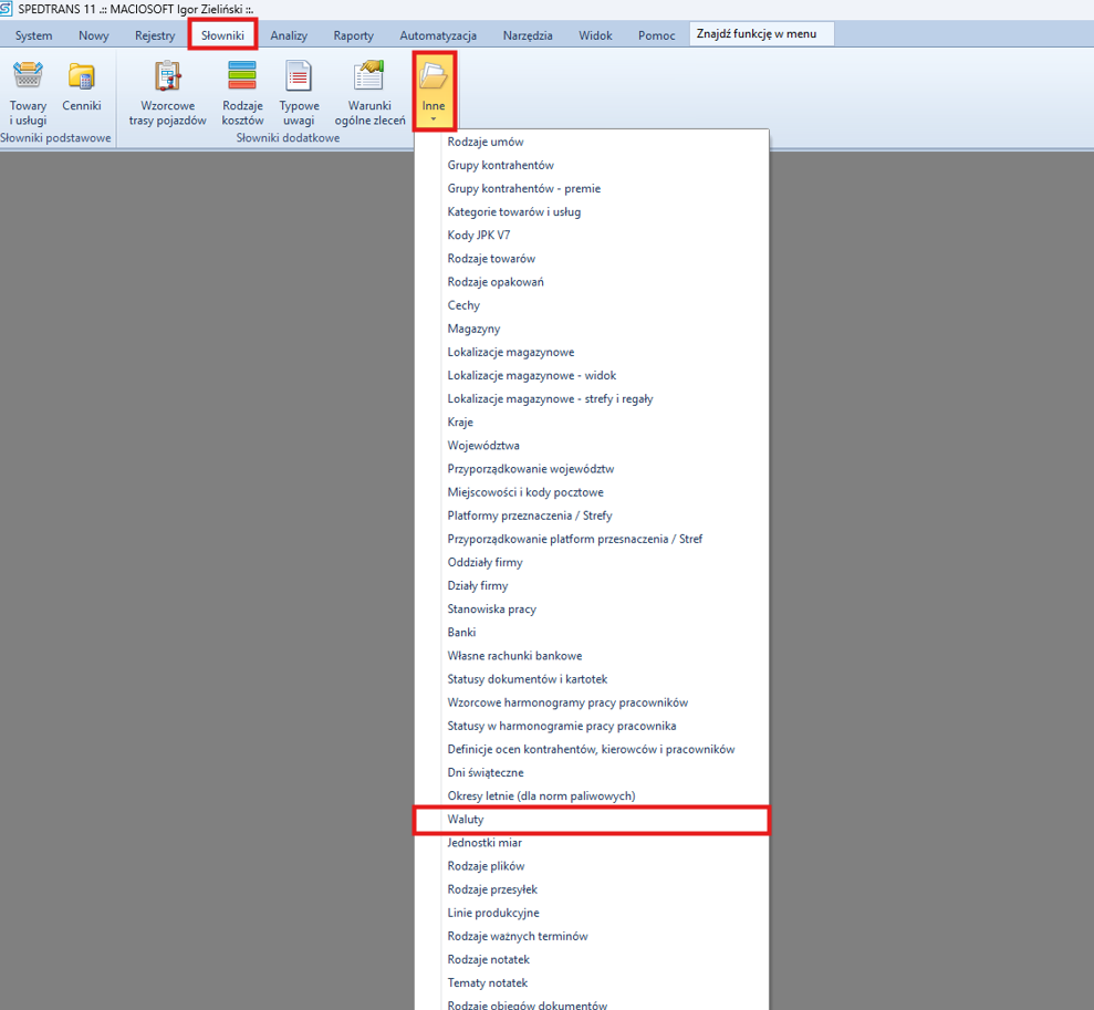 1. Wejdź do Słowniki -> Inne -> Waluty