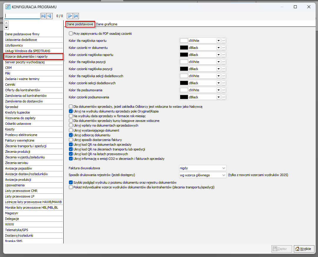 W zakładce Dane podstawowe firmy można ustawić kolory nagłówków i czcionek oraz określić, jakie dane będą wyświetlane na raportach. Można tu również ustawić, kiedy faktura będzie dwuwalutowa, sposób drukowania rejestrów oraz włączyć opcję osadzania czcionek.