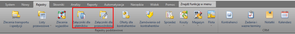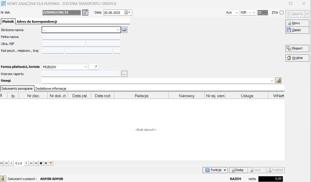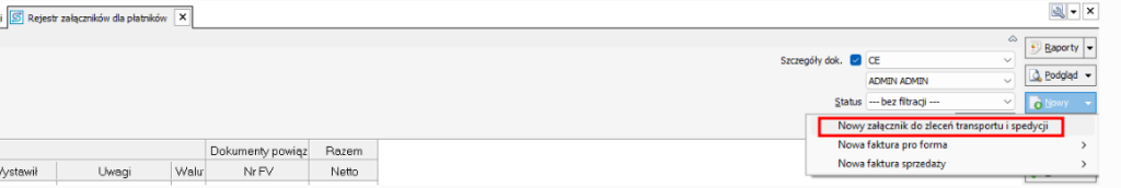 2. Dodaj nowy załącznik: z menu po prawej stronie Nowy-> Nowy załącznik do zleceń transportu