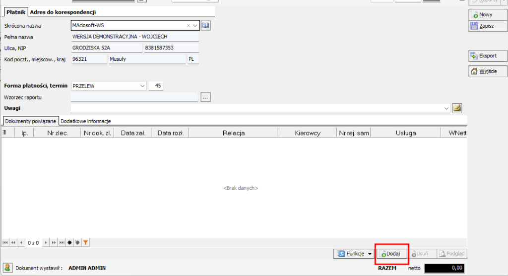 4. Kliknij na przycisk Dodaj na dole formatki załącznika celem dodania zleceń.