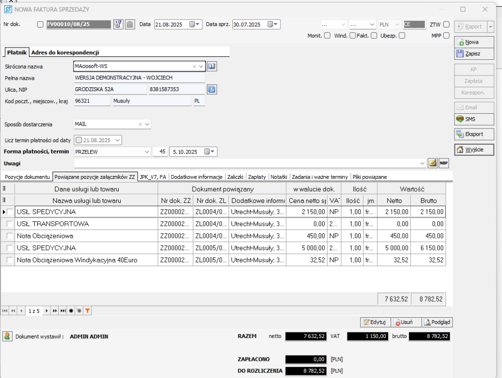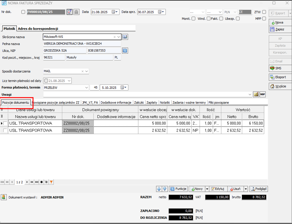 7. Zostanie wyświetlony ekran do wystawiania faktury w którym pozycje faktury dotyczą zleceń. Szczegółowe pozycje z usługami jakie są w zleceniach są przechowywane w załączniku i nie są widoczne na fakturze. Możesz je podejrzeć w trakcie kroku tworzenia faktury, gdy wybierzesz zakładkę Powiązane pozycje załączników.