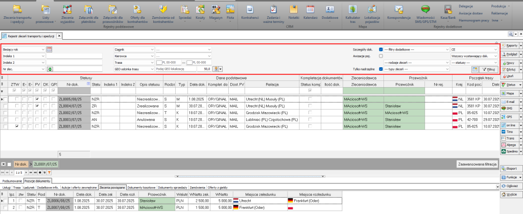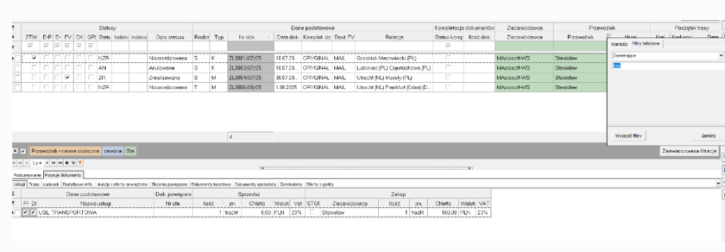 Filtrowanie, wyszukiwanie i sortowanie danych w dalszej części zostanie omówione na podstawie rejestru zleceń transportu i spedycji.