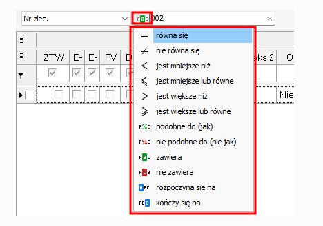 Kliknięcie na symbol wyboru reguły filtrowania [ABC] spowoduje listę dostępnych opcji wyboru reguły filtrowania. Przykładowo na rysunku poniżej mamy wybraną regułę , że nr zlecenia zawiera frazę 002. Na liście rekordów zostanie wyświetlone zlecenie o numerze ZL/0002/07/25
