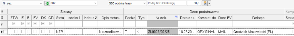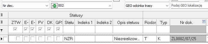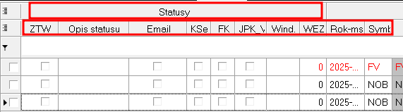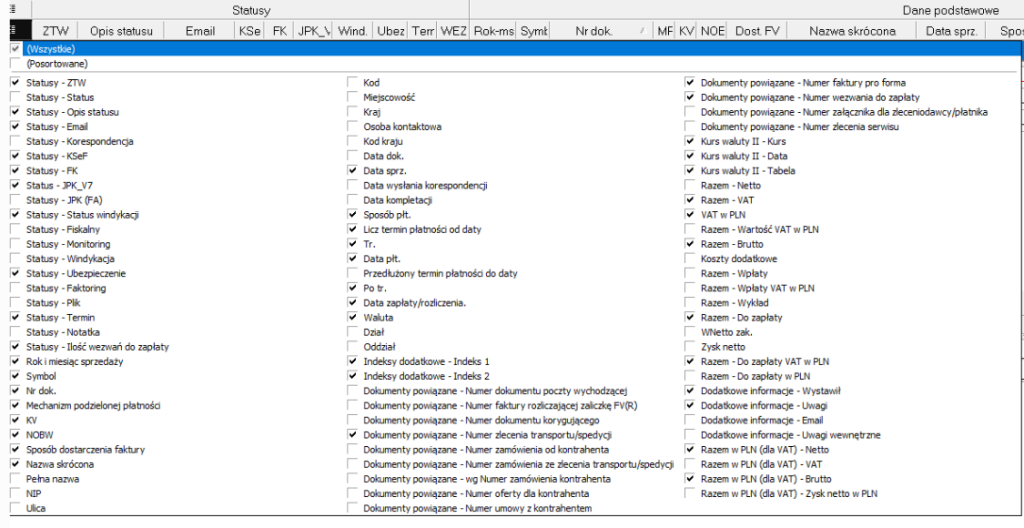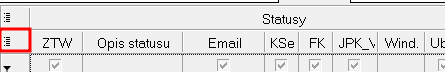 W obszarze roboczym nad wyświetlanymi rekordami znajdują się dwa poziomy z nazwami kolumn. Możemy dla swoich potrzeb wybierać interesujące nas kolumny. Górny poziom pozwala na wybranie grup informacji – zestawu kolumn. Gdy odznaczymy w grupie informacji znacznik Statusy to nie będą wyświetlały się kolumny dotyczące statusów zleceń: ZTW, Opis statusu, Email, Kse, FK..