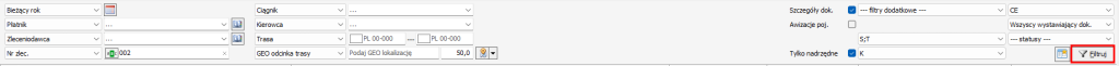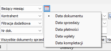 Na skrajnie prawej stronie od pola daty mamy dostępne filtry dotyczące cech dokumentów z danego rejestru takie jak: zestaw predefiniowanych filtrów dodatkowych, wybór oddziału firmy, wybór użytkownika wystawiającego dokument, rodzaj zlecenia, status dokumentu.
