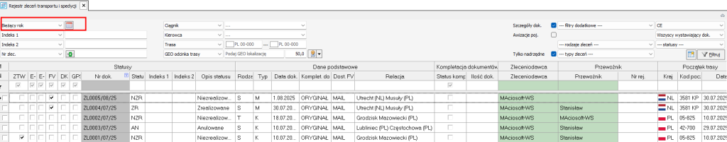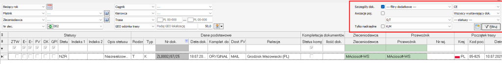 Często występujący błąd to brak w wyświetlanych rekordach zleceń z interesującego nas okresu określonego przez pole filtrowania Daty. Tak może się zdarzyć, jeśli wybrane jest inne pole daty. Gdy zaznaczymy datę końca trasy, a w zleceniu nie ma wyznaczonej trasy, to pomimo że dokument jest wystawiony w zakresie dat w filtrze – nie znajdziemy go.