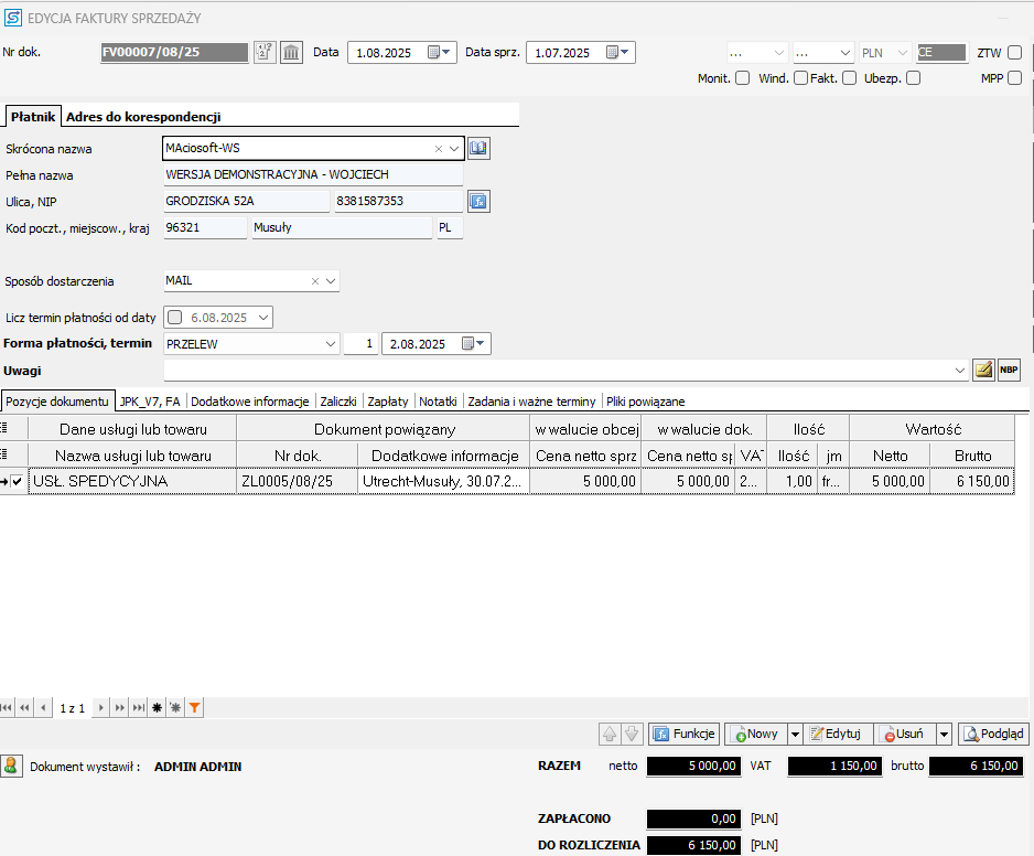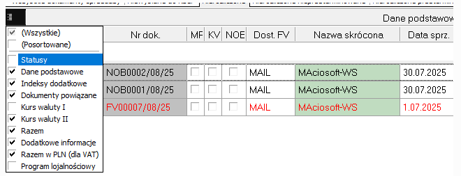 Ustawienie filtrowania po dacie dokumentu powoduje, że filtrowanie dotyczy daty wystawienia dokumentu. Przykładowa faktura sprzedaży ma datę wystawienia 01-08-2025, datę sprzedaży 01-07-2025 i datę zapłaty 02-08-2025.