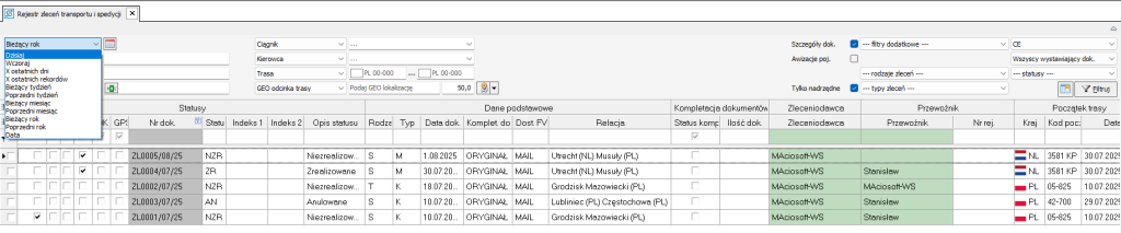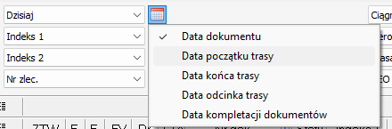 Filtrowanie po dacie odnosi się do jednego z kilku możliwych pól daty jakie występują w rekordzie. W tym przypadku dla rekordu zlecenia spedycji/transportu mamy do wyboru: