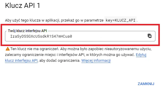 17. UTWÓRZ DANE LOGOWANIA > Klucz interfejsu API.