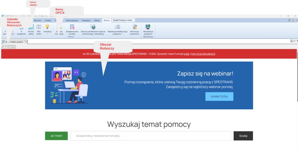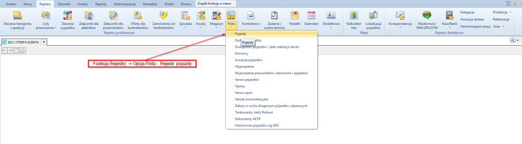 Górne menu pozwala na wybranie jednej z głównych funkcji programu: System,Nowy, Rejestry, Słowniki, Analizy, Automatyzacja, Narzędzia, Widok, Pomoc. Wybranie jednej z tych funkcji zmianę w wyświetlanych Ikonach Opcji, które odpowiadają wybranej funkcji. Przykładowo, gdy wybierzemy z górnego menu funkcję Rejestry, z ikon opcji , Flota -> Pojazdy zostaną wyświetlone obszarze roboczym rekordy dotyczące pojazdów.