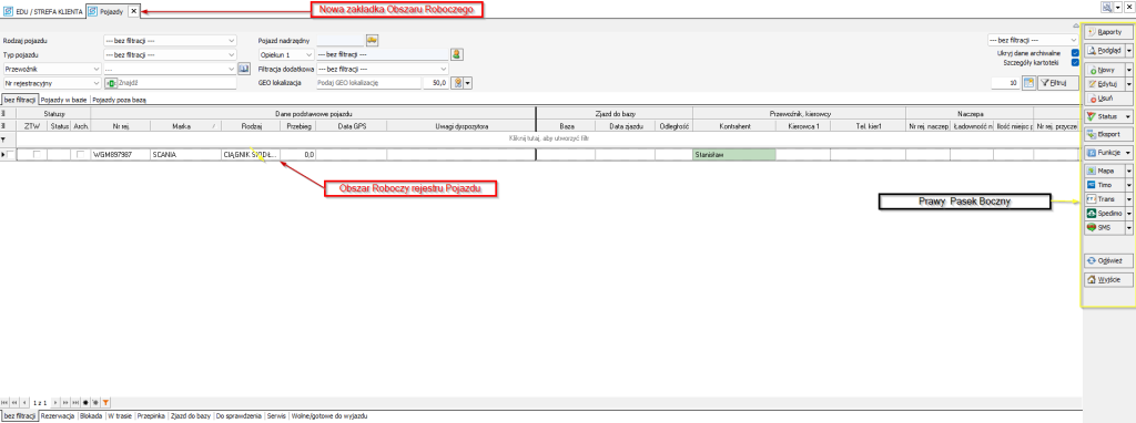 Wybranie rejestru pojazdy spowoduje, że w obszarze roboczym pojawi się nowe okno wyświetlające rekordy pojazdów i pojawi się nowa zakładka obszaru roboczego Pojazdy.