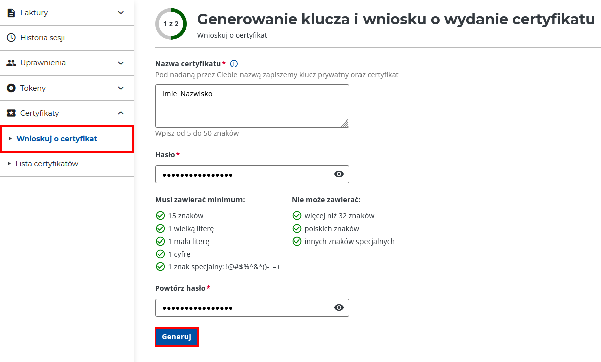 3. Wprowadź nazwę certyfikatu i hasło dostępowe. Zalecamy, aby każdy uprawniony użytkownik posiadał swój własny “imienny” certyfikat.
