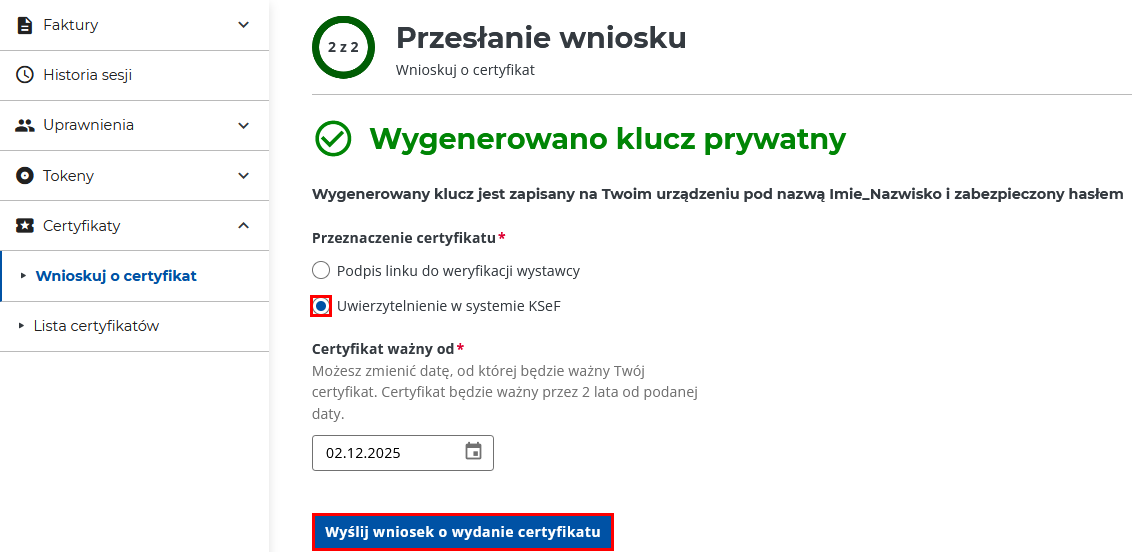 4. W kolejnym etapie konfiguracji wybierz przeznaczenie certyfikatu: „Uwierzytelnienie w systemie KSeF”. Warto pamiętać, że system udostępnia opcję tworzenia certyfikatów z określoną datą rozpoczęcia ważności, co przydaje się zwłaszcza przy zatrudnianiu nowego pracownika. Po wciśnięciu guzika wyślij wniosek o wydanie certyfikatu zostanie pobrany plik z rozszerzeniem key