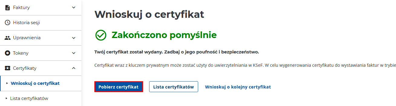 2. Przejdź do Certyfikaty > Wnioskuj o certyfikat