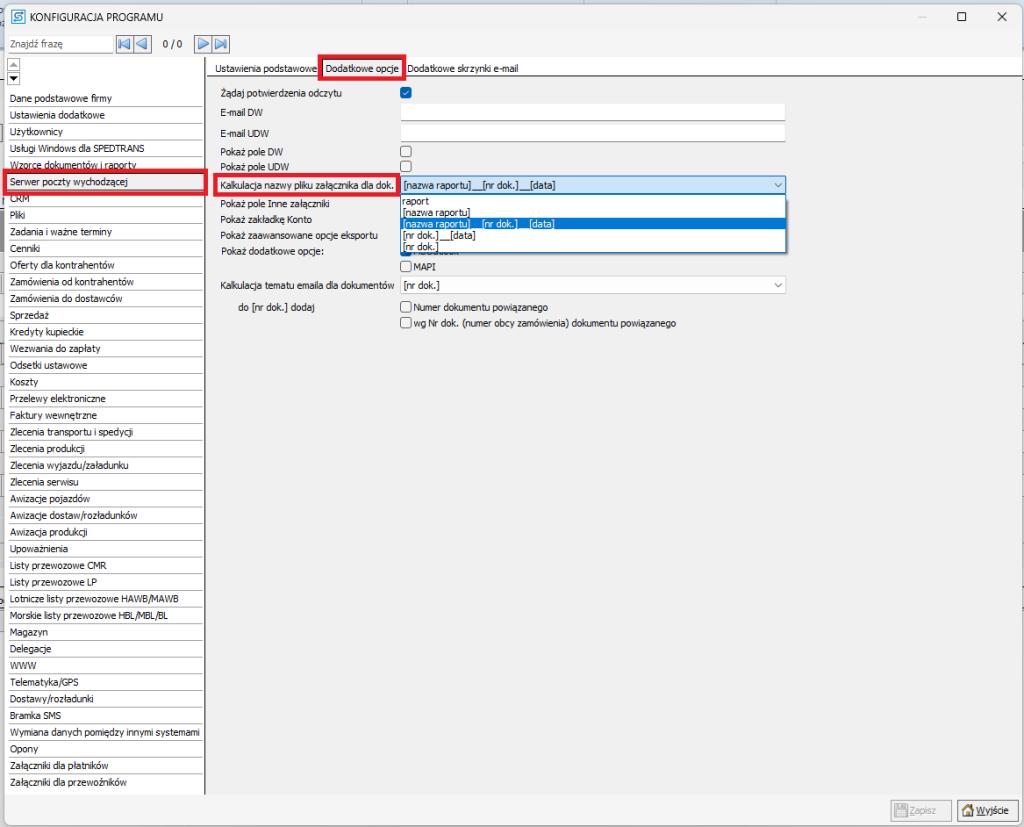 • Kalkulacja nazwy pliku załącznika dla dok. – odpowiada za to, jak zostanie nazwany plik (np. faktura PDF).
