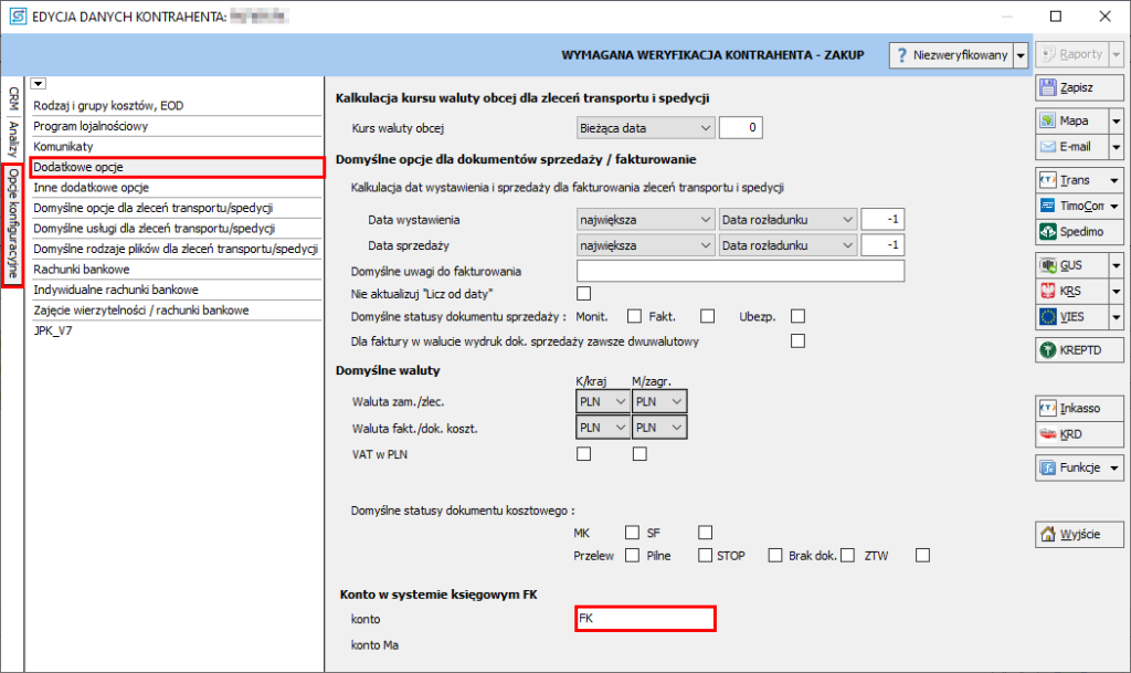 Konto FK (finansowo-księgowe) to element systemu Spedtrans, który pełni rolę identyfikatora zewnętrznego. Służy do jednoznacznego powiązania zapisów operacji gospodarczych w systemie (np. faktur, płatności, kosztów) z odpowiednimi rekordami w systemie księgowym. Dzięki temu możliwe są integracje z systemami zewnętrznymi.