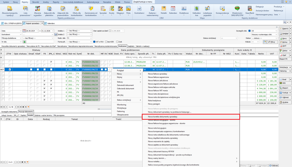 2. Kliknij prawy przycisk myszy i wybierz Nowy, następnie Nowa korekta dokumentu sprzedaży