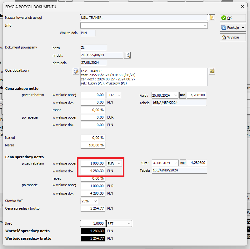3. W zakładkach Pozycje dokumentu -> Po korekcie -> Pozycje dokumentu wybierz Usługę/Towar, której wartość ma być skorygowana.