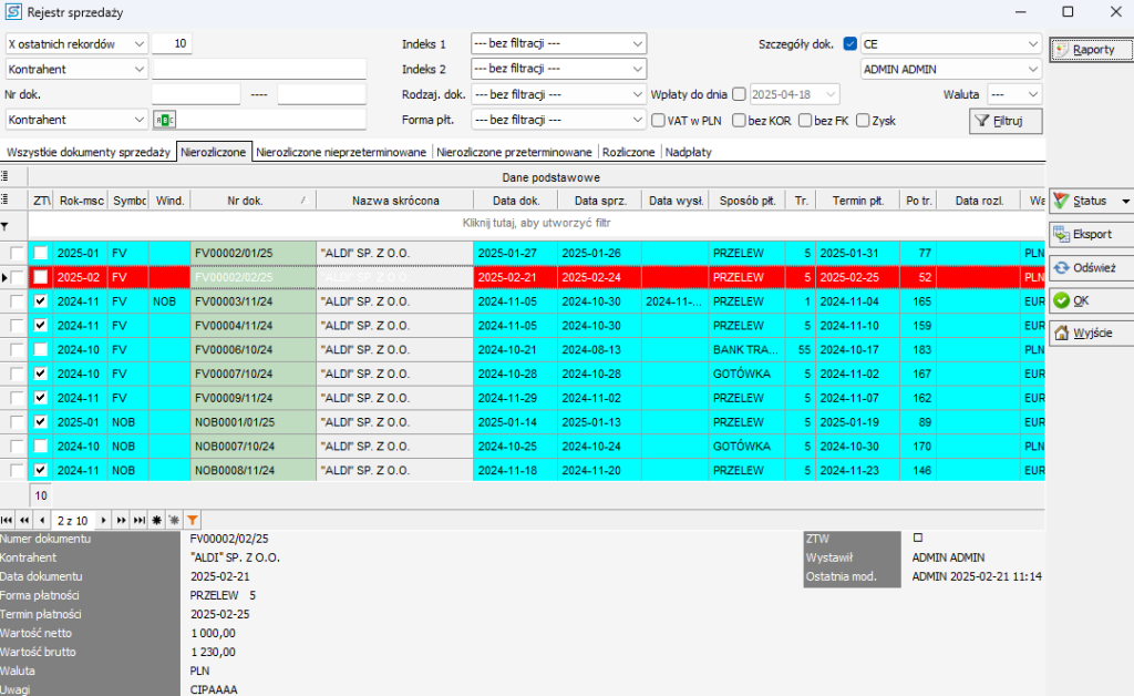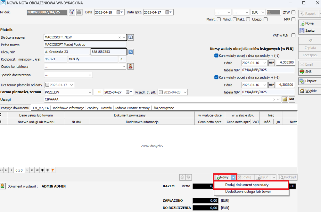 3. Możesz również dla danego kontrahenta załączyć wiele faktur opłaconych po terminie. Nowa NOBW > Nowy > Nowy dokument sprzedaży.