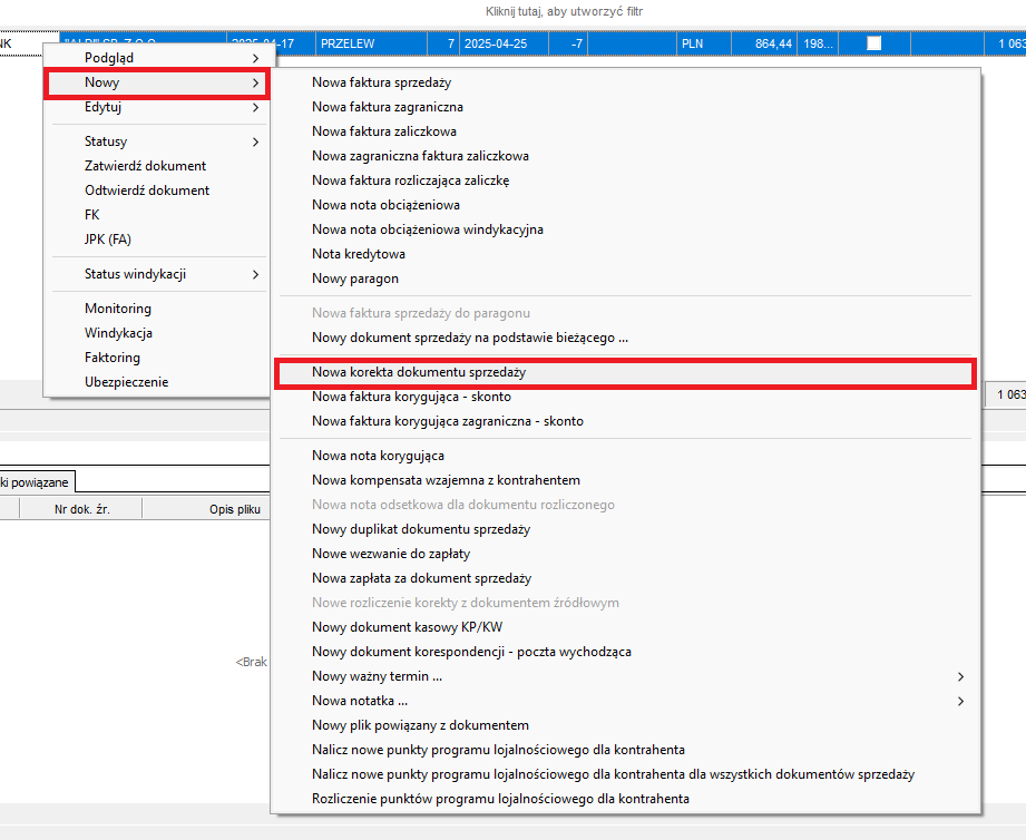 3. Kliknij prawym przyciskiem myszy na wybrany dokument > Nowy > Nowa korekta dokumentu sprzedaży.