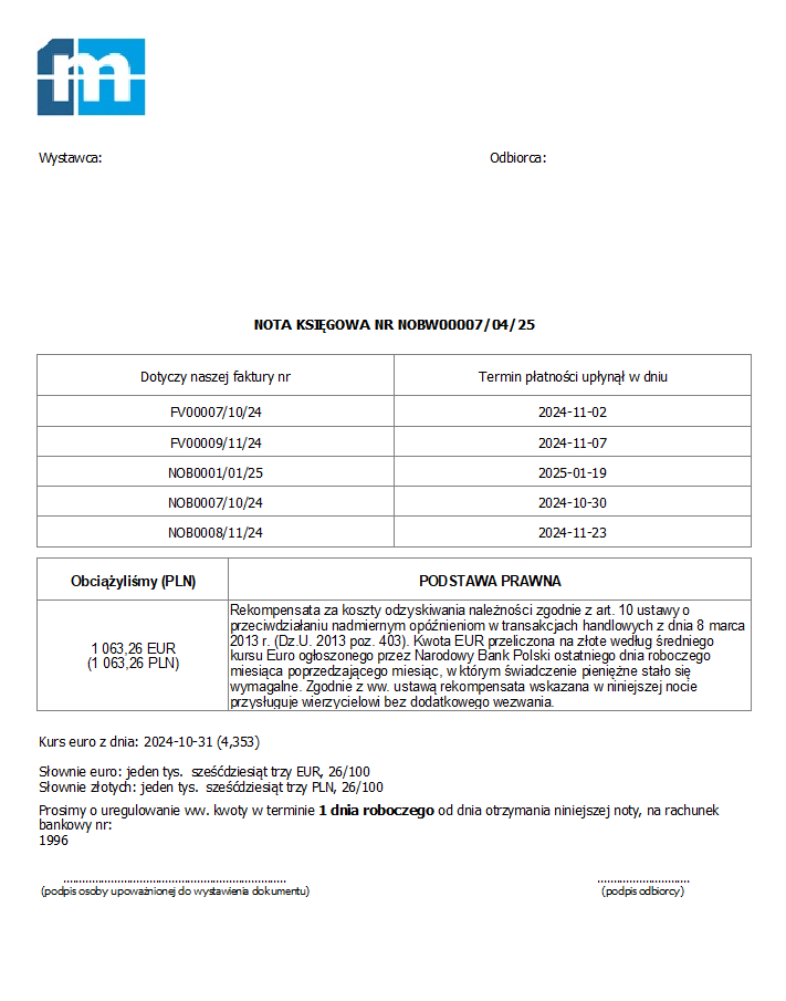NOBW można wystawić do każdej faktury która nie została opłacona w określonym terminie. Zgodnie z ustawą z dnia 08 marca 2013 roku o przeciwdziałaniu nadmiernym opóźnieniom w transakcjach handlowych (Dz. U. 2020 poz. 935; dawniej „ustawa o terminach zapłaty w transakcjach handlowych) wysokość noty obciążeniowej może być następująca: