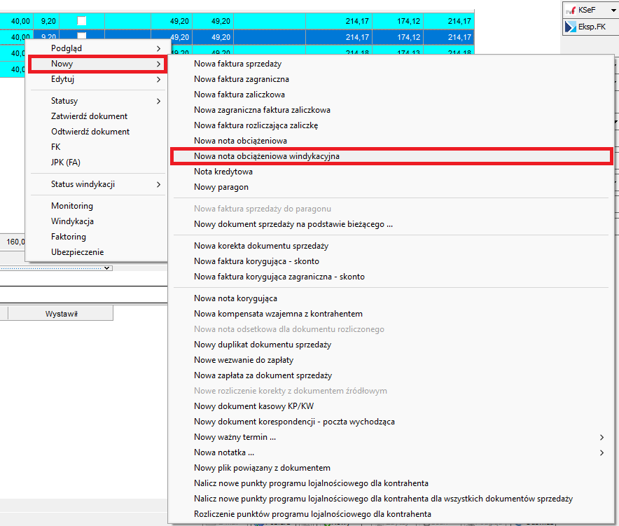 2. Kliknij prawym przyciskiem myszy (PPM) na dokument do którego chcesz wystawić NOBW > Nowy > Nowa nota obciążeniowa windykacyjna.