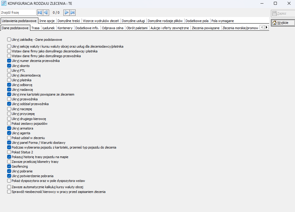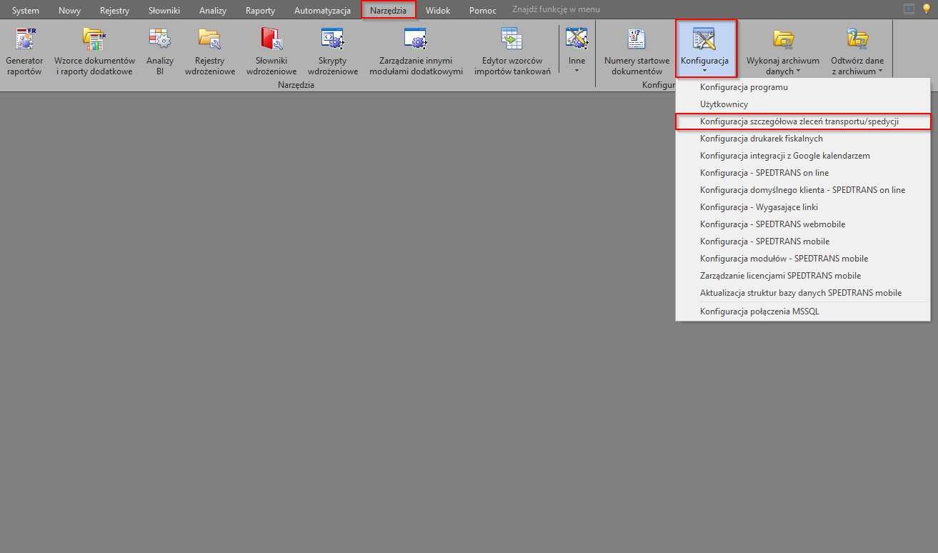 - Z rozwijanej listy wybierz opcję Konfiguracja szczegółowa zleceń transportu/spedycji