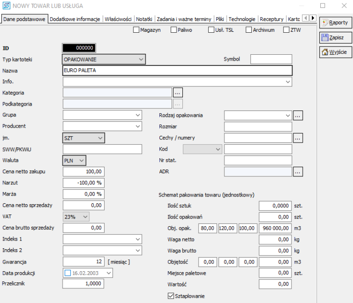 2. Definicja palet: Palety, które mają być przedmiotem obrotu, muszą zostać wprowadzone do słownika Towary i usługi jako pozycje o typie kartoteki Opakowanie.