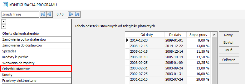 - Wciśnij przycisk Nowy i ustaw odsetki wedle wymagań (W tej instrukcji podamy dokładnej stawki – użytkownik musi samodzielnie sprawdzić i wpisać aktualną wysokość odsetek ustawowych, odpowiednią do swojej sytuacji.)