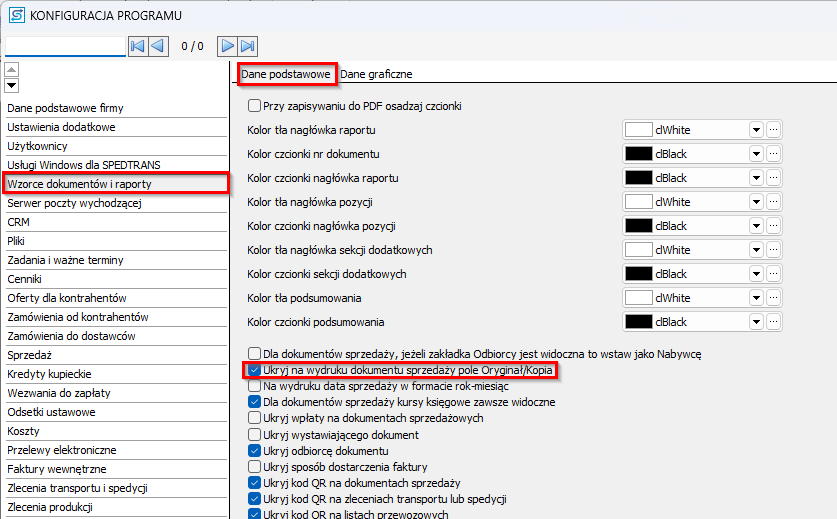 W programie SPEDTRANS istnieje możliwość dostosowania wyglądu wydruków dokumentów poprzez konfigurację wyświetlanych pól oraz dodatkowych oznaczeń. Użytkownik może decydować, które elementy będą widoczne na dokumentach generowanych z programu. Jedną z dostępnych opcji jest włączenie lub ukrycie oznaczeń „ORYGINAŁ” oraz „KOPIA”, w zależności od potrzeb. Poniżej opisano, jak skonfigurować te ustawienia.