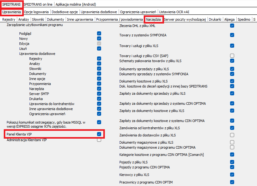 - SPEDTRANS > Uprawnienia > Narzędzia > zaznaczamy Panel Klienta VIP