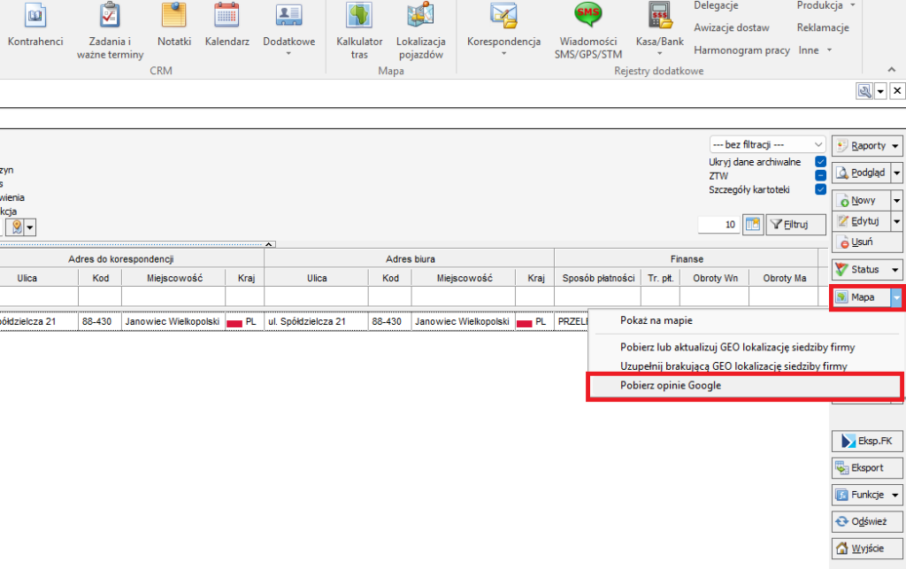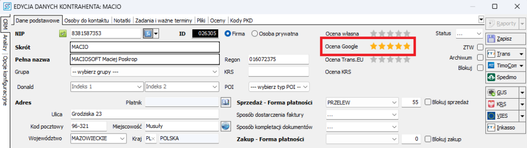 W rejestrze kontrahentów dodano opinie z Google w formie wizualnych gwiazdek, umożliwiających szybki podgląd oceny danego kontrahenta.