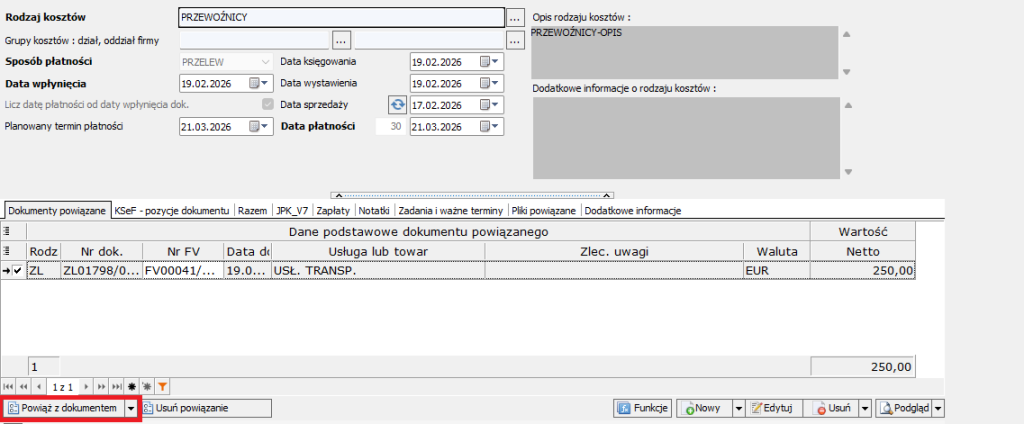1. Wejdź w edycję dokumentu kosztowego i kliknij Powiąż z dokumentem