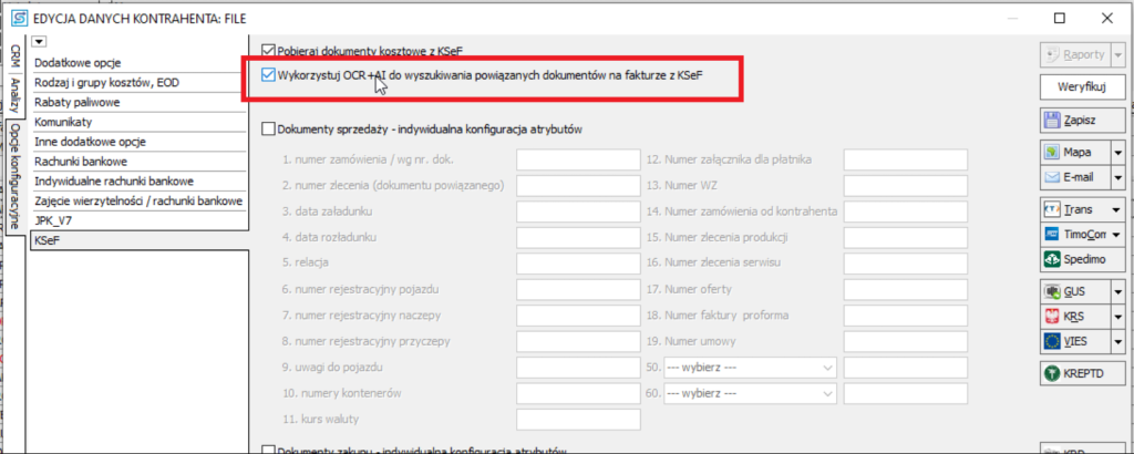 Po włączeniu tej opcji program wykorzystuje OCR+AI do odczytania danych z faktury pobranej z KSeF, a następnie na ich podstawie wyszukuje w systemie dokumenty, które mogą być z nią powiązane.