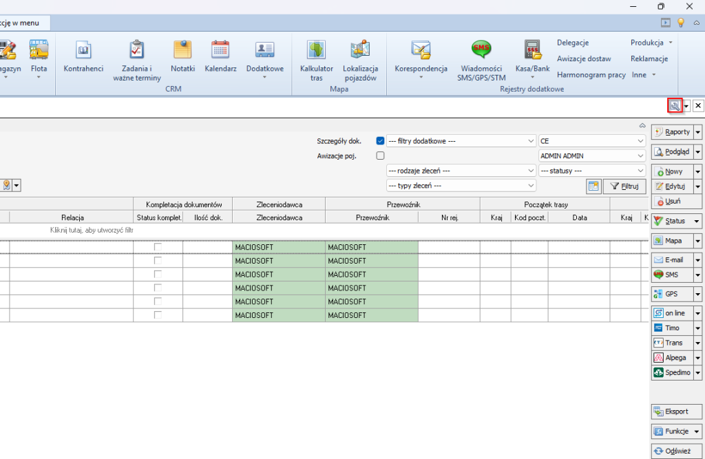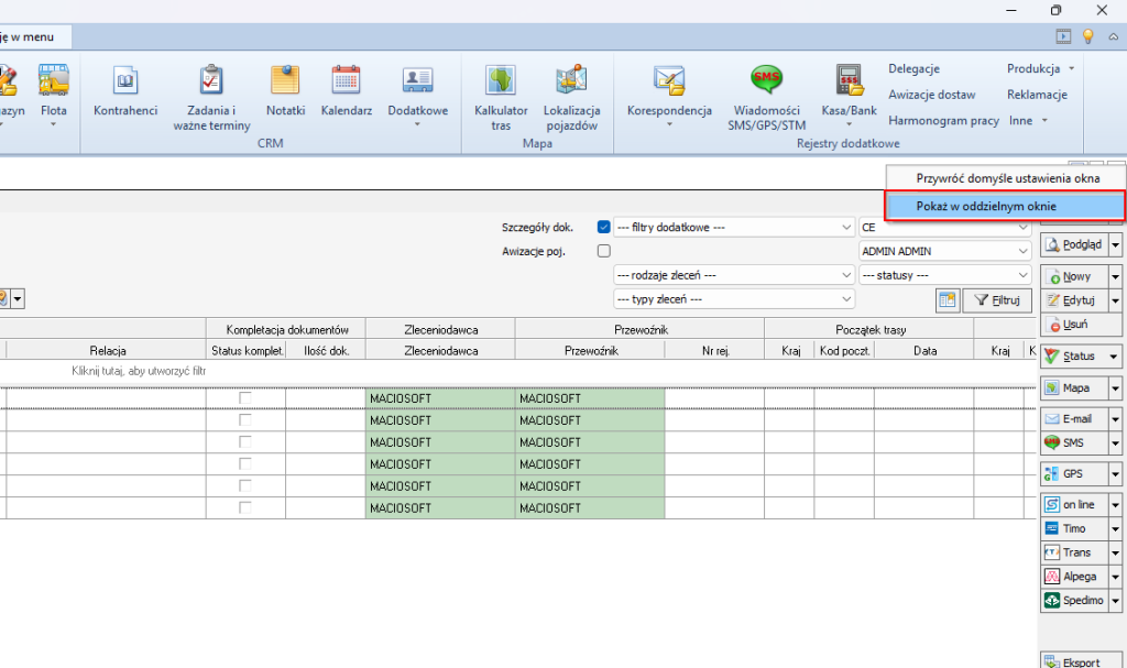 W systemie SPEDTRANS użytkownik ma możliwość otwarcia wybranego rejestru w oddzielnym oknie, co znacząco zwiększa komfort pracy oraz ułatwia jednoczesne operowanie na wielu zestawieniach danych. Funkcja ta pozwala na bardziej elastyczne zarządzanie informacjami, umożliwiając równoległe przeglądanie kilku rejestrów bez konieczności przełączania się między zakładkami w głównym oknie aplikacji.