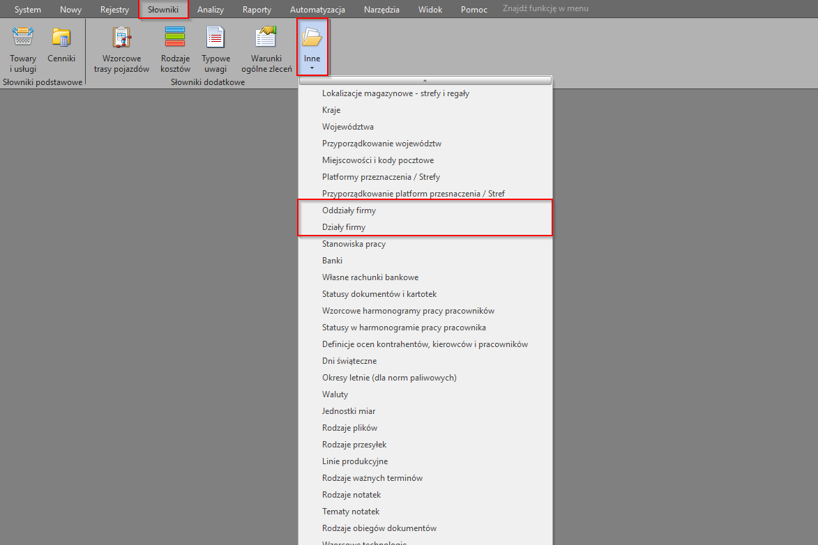 - Z listy wybierz Działy firmy lub Oddziały firmy – w zależności od tego, co chcesz dodać
