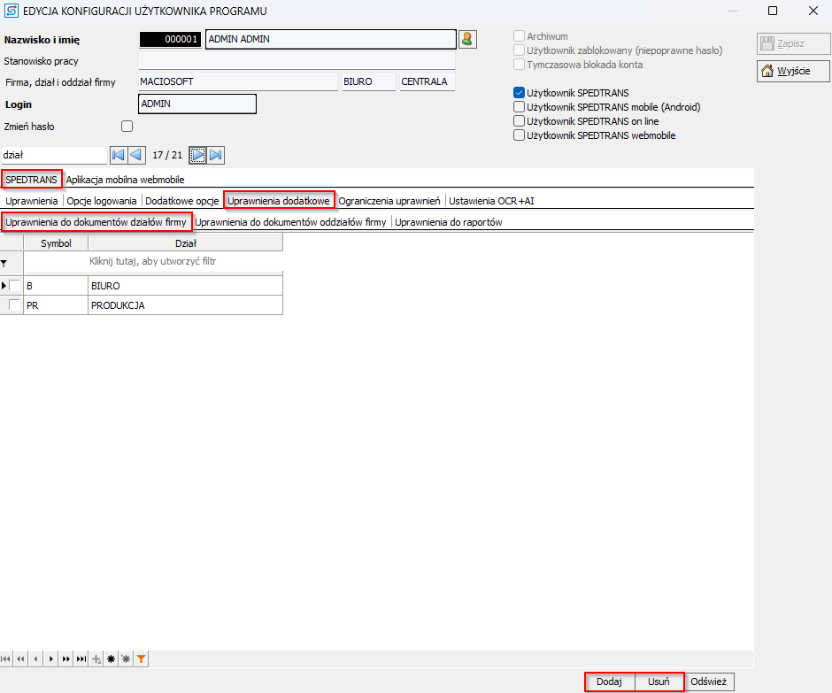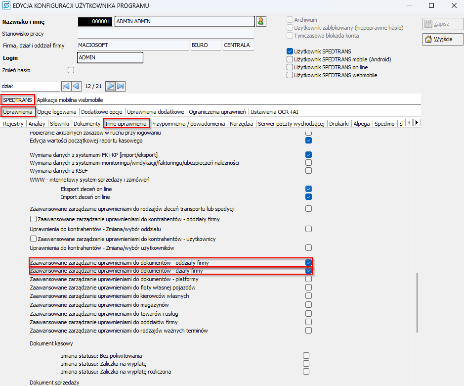 - W zakładce SPEDTRANS wybierz uprawnienia dodatkowe i nadaj użytkownikowi uprawnienia do odpowiednich działów/oddziałów