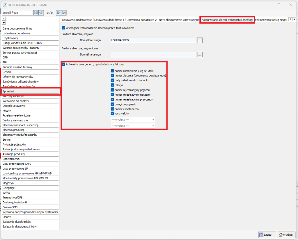 W programie SPEDTRANS istnieje możliwość globalnego sterowania tym, jakie informacje są automatycznie przenoszone do pola „Opis dodatkowy” podczas wystawiania dokumentów sprzedaży do zleceń transportowych i spedycyjnych.